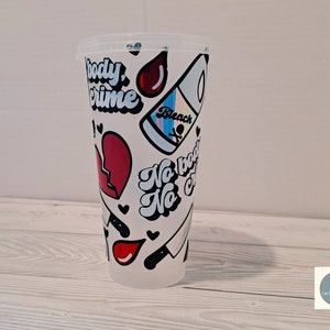 The bold design features a cheeky Cupid-inspired theme, complete with hearts, playful graphics, and a vibrant color palette that pops against the black background. Whether you're sipping iced coffee, water, or your favorite cold drink, this cup will keep you cool while making a statement.